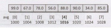 (99.0, 67.0, 78.0, 56.0, 88.0,90.0, 34.0, 85.0). Calculate the address of avg