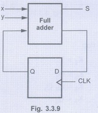 Example 3.3.5 A sequential circuit has one flip-flop Q, two inputs x and y, and one output S. It consists of a full adder circuit connected to a D flip-flop, as shown below. Derive the state table and state diagram of the sequential circuit. AU Dec.-07, Marks 12