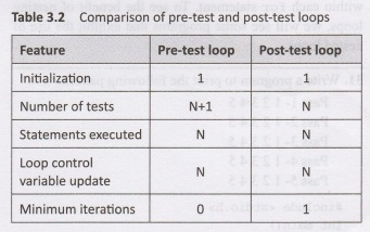 Look at Table 3.2 which shows a comparison between a pre-test loop and a post-test loop.