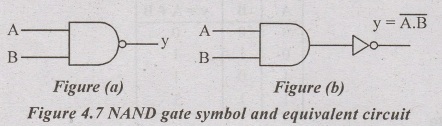 NAND gate actually means NOT-AND and implies an AND gate function with a complemented output. A standard logic symbol for a two-input NAND gate and equivalency of NAND gate is shown in fig 4.7(a) & (b).
