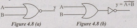 The term NOR is a constraction of NOT-OR and implies an OR function with complement figure 4.8 (a) & (b) shows the standard symbol and equivalent circuit.