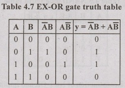 The output EX-OR gate is logic high when the both inputs are different. When output is low, both inputs are same. It is shown in the table 4.7.