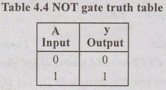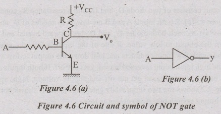 The circuit in figure 4.6(a) shows the CE amplifiers, which act as a switch. Operates in cut off and saturation region. When A is low (0), then transistor gets cut off and is unable to conducts, thus full voltage of Vcc is available at the output terminal. Thus A is low, V0 is high. Whereas when A is high, it will saturate the transistor, give a low output (0). The fig 4.6 a & b shows the NOT gate circuit and symbol. The Table 4.4 shows the truth table of NOT gate.