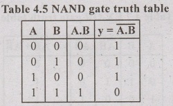 The NAND gate is a universal gate as it can be used to construct an AND gate, an OR gate, and inverter gates. The output of NAND gate is complement of AND gate output. The table 4.5 shows the truth table of NAND gate.