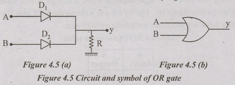 An OR-gate has two (or) more inputs and only one output, which is equal to the OR sum of all inputs. Figure 4.5 shows the circuit of input OR gate and symbol. The circuit consists of two inputs A, B two diodes D1, D2 and resistance R.