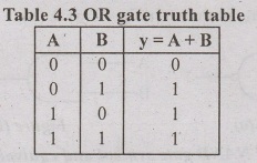 If both the inputs are low (0), then diode D, and D, do not conduct, giving low (0) at y. If any input A (or) B is high, the diode with that high input conducts giving high (1) output. If both the inputs are high, both diodes conduct, giving high (1) output. Table 4.3 shows the truth table of OR gate.