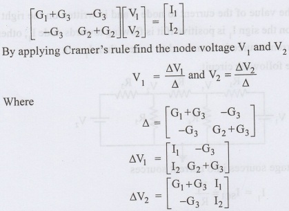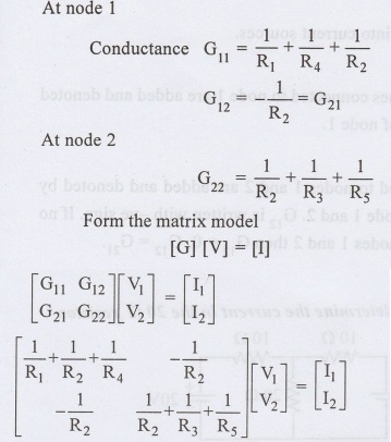 By solving the above matrix, we can find nodal voltages V1 and V2.