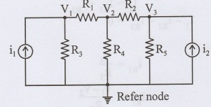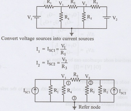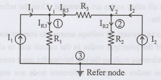 The first step is to convert all voltage sources to current sources. The second step is to identify all the principal nodes in the circuit and to choose a reference node. To select the reference node as the one having the most component connected to that node. All the nodes except the reference node are numbered and their corresponding voltages are designated as V1,V2,…. etc. The reference node and other nodes are indicated as shown in the circuit.