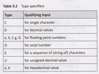 type specifiers for fscanf function are given in Table 9.2.