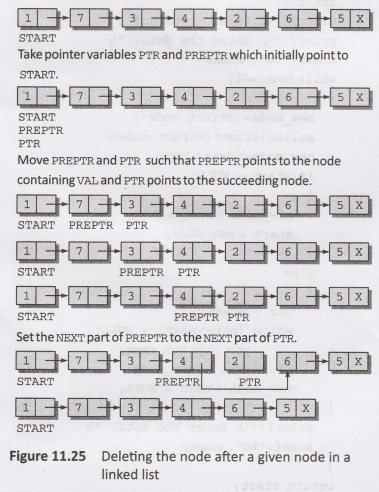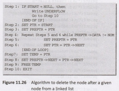In Step 2, we take a pointer variable PTR and initialize it to START. That is, PTR now points to the first node of the linked list. In the while loop, we take another pointer variable PREPTR such that it always points to one node before PTR. Once we reach the node containing NUM and the node succeeding it, we set the NEXT pointer of the node containing NUM to the address contained in NEXT field of the node succeeding it. The memory of the node succeeding the given node is freed and returned back to the free pool.